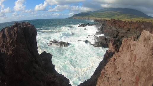 Бьются волны прибоя о вулканические скалы плато Янкито. Остров Итуруп.