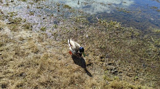 Утка плавает на газоне в парке