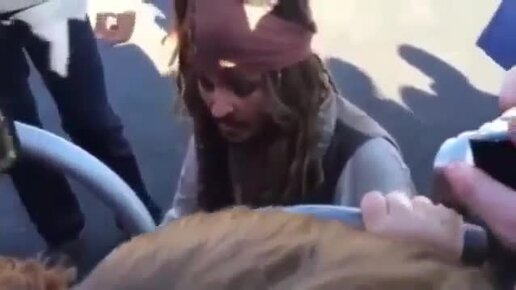 Джонни Депп в костюме Джека Воробья разговаривает с детьми.