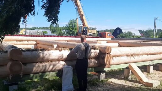 Сруб дома во время установки и непосредственно после. Размер дома 8х9+3м (размер по крыше 9х11 м.)