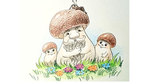 Старичок- боровичок. Рисунок черной тушью и цветными карандашами.