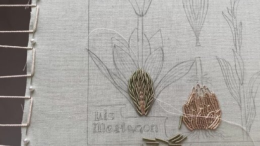 Вышивка фигурной и гладкой канителью второго лепестка лилии.