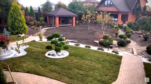 Ландшафтный дизайн частного сада. Укладка рулонного газона. Оформление тенистой зоны.