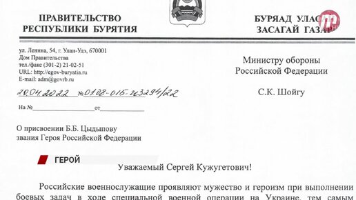 Глава Бурятии просит поддержать ходатайство о присвоении звания Героя России нашему земляку лейтенанту Балдану Цыдыпову
