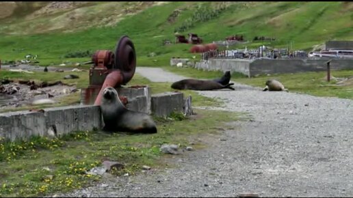 Морские львы и слоны на бывшей китобойной станции Grytviken, Южная Георгия, Антарктика