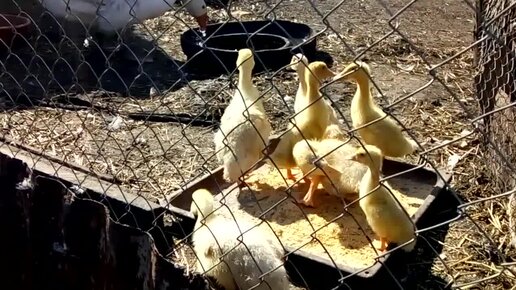 Деревенское подворье,гусак хочет водиться,утята боятся.Утка хочет парить яйца.