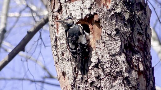 Самка большого пестрого дятла готовит гнездо