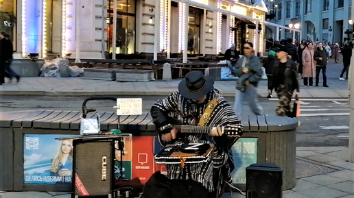 Музыкант играет "Дом восходящего солнца" на фоне предзакатной Москвы
