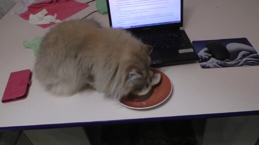 Кот Кося ест хлеб