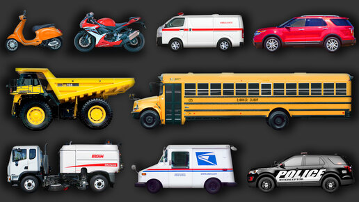 Мультик про машинки для детей. Виды транспорта: Скорая Самосвал Мотоцикл Внедорожник Полицейская машина