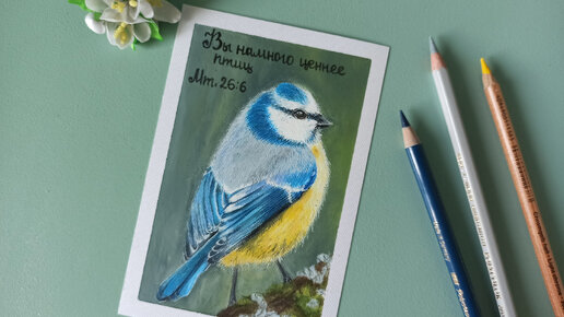 Как нарисовать птичку - синичку цветными карандашами + масляная пастель