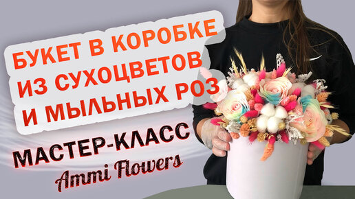 Букет в цилиндре из сухоцветов и мыльных роз