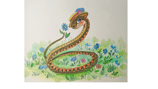 Изящная змейка, рисунок черной тушью и цветными карандашами.