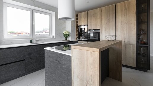 Современная кухня из ЛДСП: ручки Gola-профиль, встроенная в пенал техника, остров с варочной панелью, фурнитура Hettich