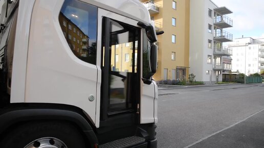 Городской грузовик Scania с кабиной серии L, с распашной стеклянной дверью.