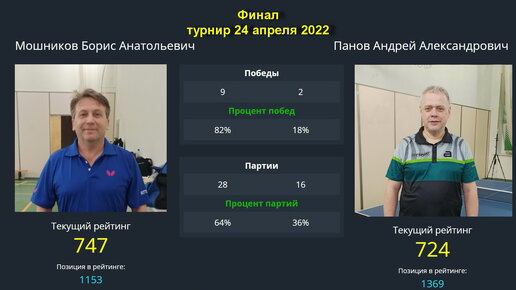 Классический финал карельского тенниса Панов А.(725)-Мошников Б(748). Турнир 24 апреля 2022.