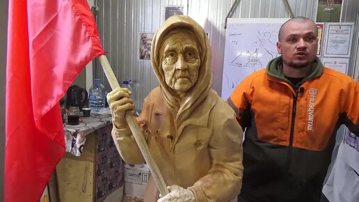 Воронежец вырезал из дерева скульптуру украинской бабушки с красным флагом