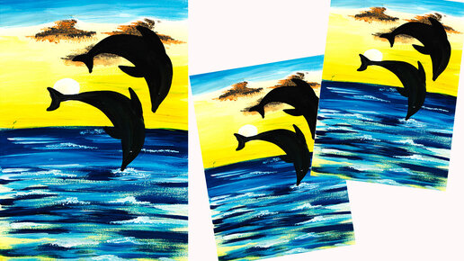 Как легко нарисовать морской пейзаж. Рисуем дельфинов. Картина для творчества с детьми.