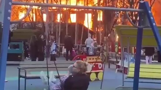 Женщина с ребенком, качающаяся на качелях на фоне горящего дома, показывает всем, как бороться со стрессом. Просто игнорируйте.