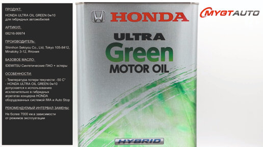 Масло моторное для гибридных автомобилей Honda ULTRA OIL GREEN 0W-10 08216-99974 #ANTON_MYGT