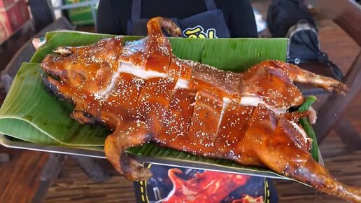 Тайский рынок - уличная еда. Жаря т поросят на вертеле. Посмотрите как это.