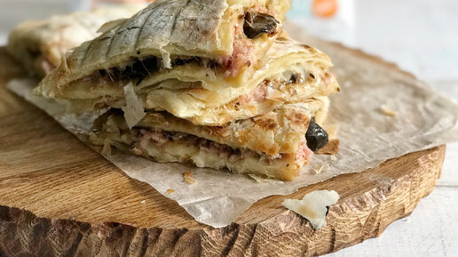 Слоеный пирог с грибами, ветчиной и сыром на решётке!
