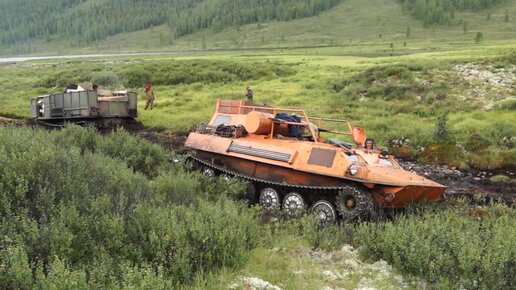 МТЛБ вытягивает АТС-59 из болота