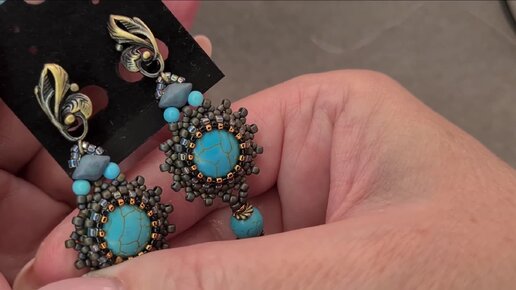 Серьги Бирюзовые сны. Как сплести серьги из КРУГЛЫХ кабошонов и бисера.
