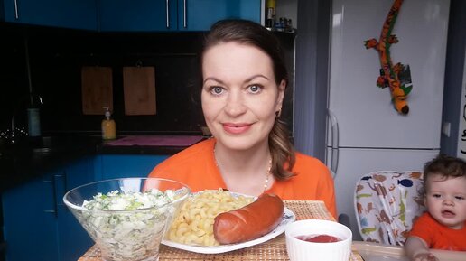 Мукбанг Макароны с сарделькой, салас с черемшой и яйцами/MUKBANG
