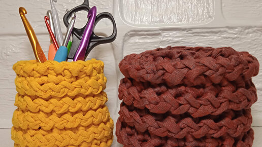 Корзина из трикотажной ленты с разными стежками и краями