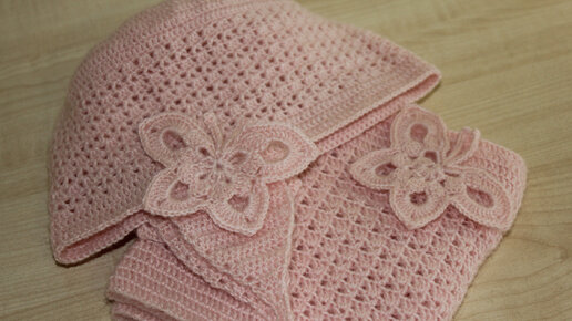 Ажурная шапочка и снуд крючком с бабочками для девочки 1 - 1,5 года на весну, как связать ажурную шапочку подробное бесплатоое описание