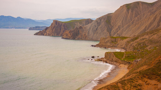 Поднялись на гору в поселке Орджоникидзе, Крым. Показываем красивый вид на пляж и море