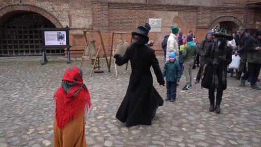 Чумной доктор танцует на игровой экскурсии в Москве, на Крутицком подворье и дети