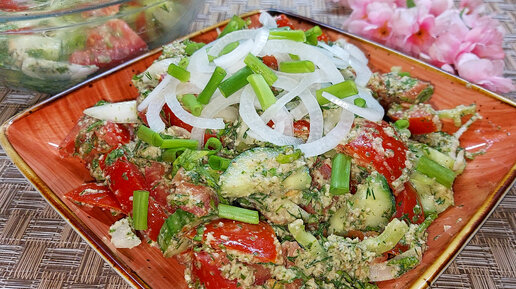 Простой грузинский салат, но какой вкусный. Все дело в заправке. Такая закуска украсит любой стол.