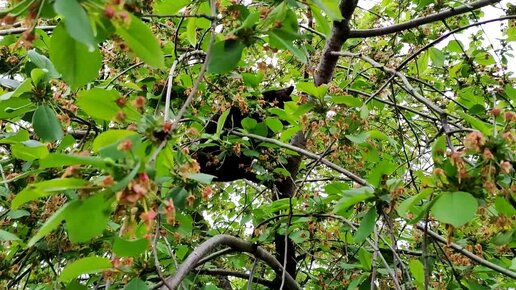 Черный кот Черныш залез на вишню и теперь его не достать! Трясу дерево, пытаюсь скинуть кота!