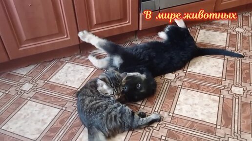 Котенок Кузя заставляет щенка Барона выполнять команду лежать.