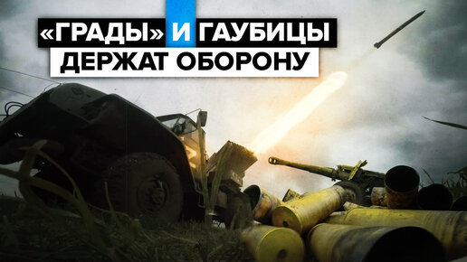 Система залпового огня «Град» и пушка-гаубица Д-20 производят выстрелы в Мариуполе