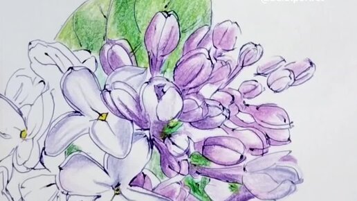 Ветка сирени. Процесс рисования цветными масляными карандашами.