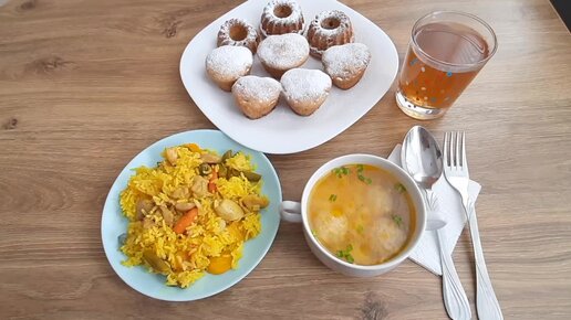 Готовка выходного дня. Суп с фрикадельками, курица с рисом и овощами, кексы.