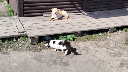 Собачка, кошки в городе Свияжск вблизи набережной города. 6.05.2022