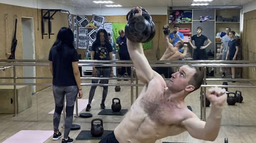 Тренировка с гирями. Толчок гирь 32 кг. Турецкий подъем с гирями 32 кг в одной руке. Подтягивания. Отжимания на кольцах. Пресс.
