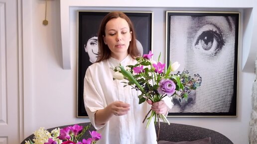 Весенний букет с тюльпанами, фрезией и нарциссами.