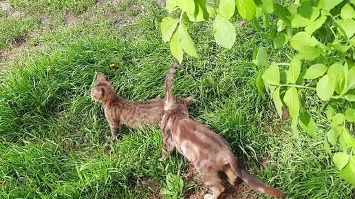 Взрослый кот играет в траве с котятами . Деревенские питомцы . Любовь не имеет возраста даже у животных .