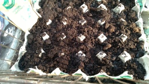 На грядках в яичных лотках морковь и горох