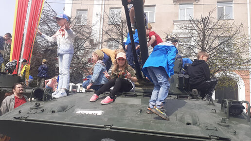 Ем кашу, смотрю военную технику. День Победы в Кургане.