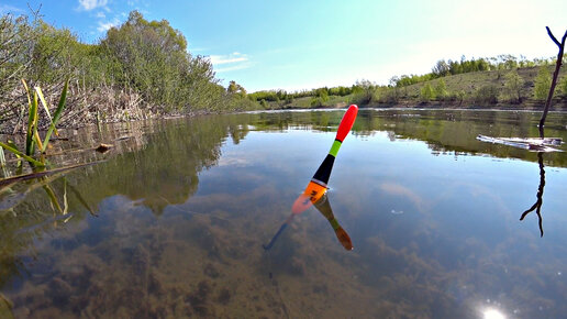 Ловля карася на маховую удочку с поплавком. Рыбалка в тихом месте.