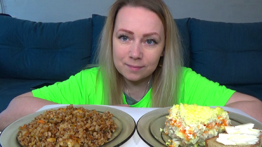 Мукбанг Гречка по- купечески с мясом. Салат мимоза.