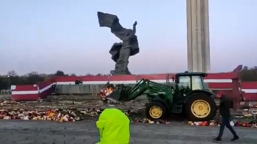 В Риге трактором убрали цветы, возложенные 9 мая к памятнику советским воинам. Люди против.