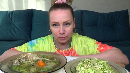 Куриный бульон с луком и отварная курятина . Салат из капусты . Мукбанг.