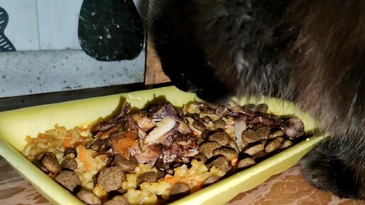 Черный кот Фарик кушает, выбирает вкуснятину! Большой и пушистый черный кот, обедает!